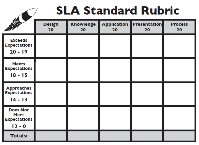 Students at SLA are assessed through a variety of means with a focus on project-based learning and our five core values of inquiry, research, collaboration, presentation, and reflection. Our students do not take the School District of Philadelphia benchmark exams; rather, they complete projects in every subject that are assessed based on the SLA rubric (see below). The descriptions in the empty boxes are filled in according to the subject and project nature.
