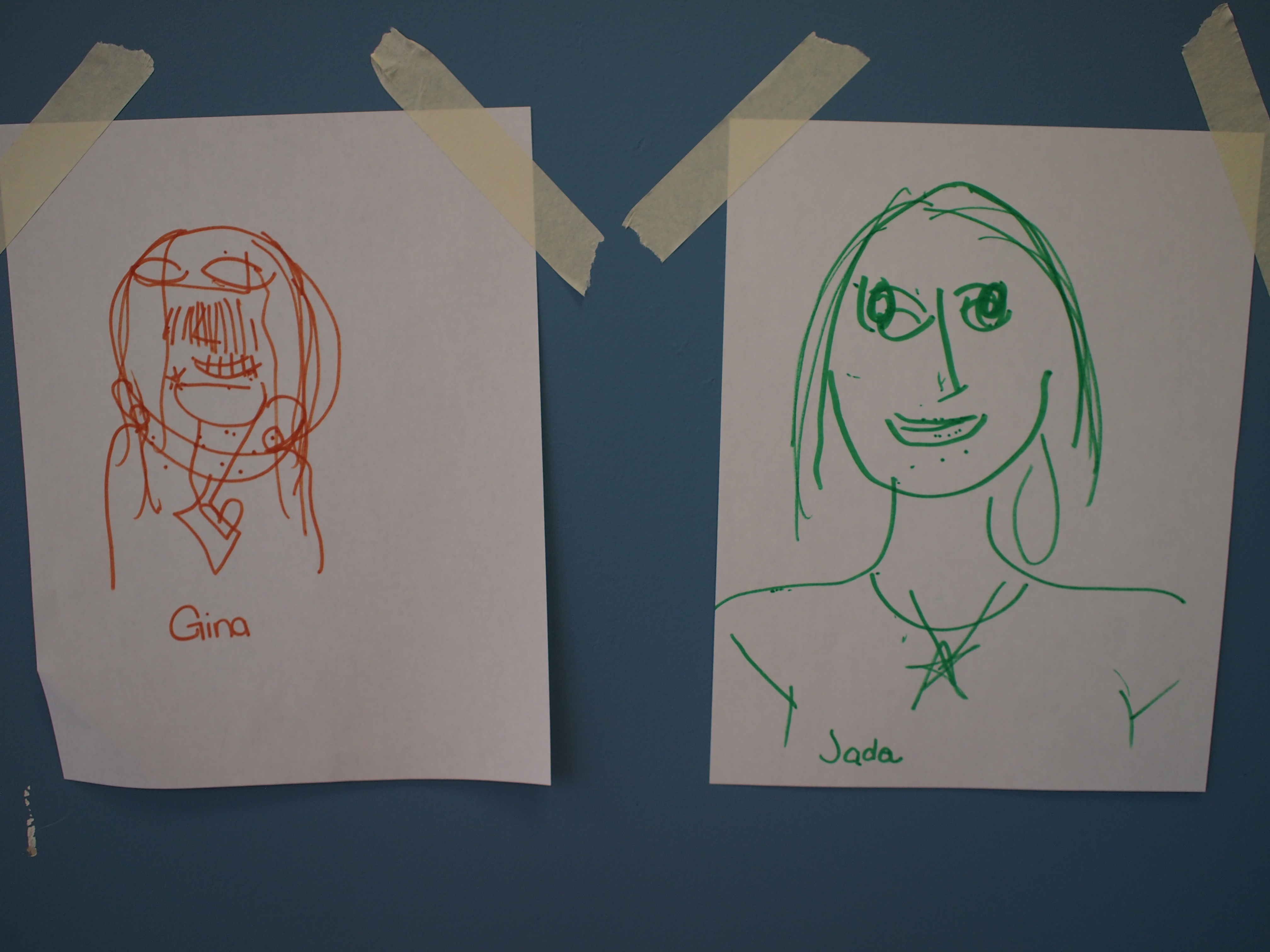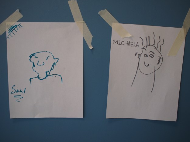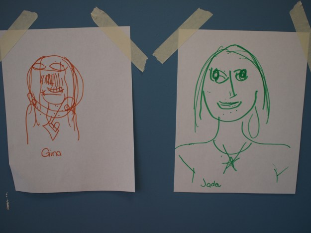 One tense minute later, you have a lot of hilarity on the page. People pass the papers around; several of ours ended up on a piece of string and were displayed all year in the main office. We talked about what we focused on (hair style! earrings!) and what we left out or messed up (ears, noses, eyes, mouths…)