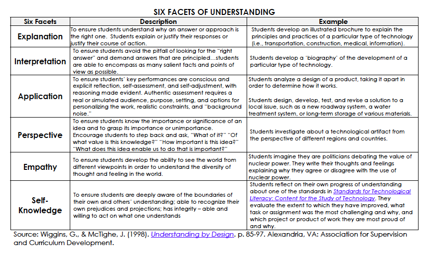 We looked at a few documents outlining key ideas behind Understanding By Design, including the “six facets of understanding” described below. People were asked to discuss: which of these are you already hitting in your classroom? Which are eluding you and/or your students?