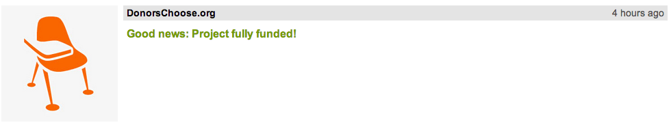 Screen shot 2013-02-12 at 1.19.33 PMLast week, I finally joined Donors Choose. My first project — books to be added to my classroom’s independent reading library — was funded in under 24 hours.